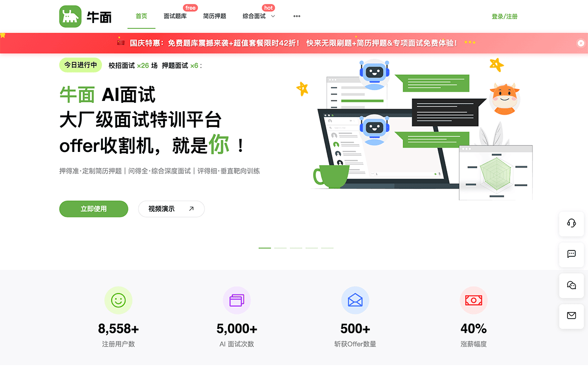 牛面是一个专为技术人员设计的专业AI面试平台,对标真实大厂面试场景,提升面试技巧及求职竞争力。牛面AI技术模拟真实面试官的行为,对求职候选人进行自动化提问、评估和反馈,提供Java/Go/前端等技术专项训练,3000+大厂真题库,个性化押题预测,帮程序员精准补强技术短板,轻松拿offer。不管你是校招应届生,还是社招跳槽选手,牛面AI面试都能成为你的「面试教练」!