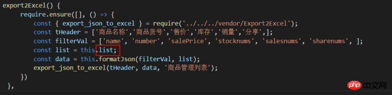 data(){ return{ list:[ { name:'韩版设计时尚风衣大', number:'MPM00112', salePrice:'¥999.00', stocknums:3423, salesnums:3423, sharenums:3423, }, { name:'韩版设计时尚风衣大', number:'MPM00112', salePrice:'¥999.00', stocknums:3423, salesnums:3423, sharenums:3423, }, ] } methods:{ formatJson(filterVal, jsonData) { return jsonData.map(v => filterVal.map(j => v[j])) }, export2Excel() { require.ensure([], () => { const { export_json_to_excel } = require('../../../vendor/Export2Excel'); const tHeader = ['商品名称','商品货号','售价','库存','销量','分享',]; const filterVal = ['name', 'number', 'salePrice', 'stocknums', 'salesnums', 'sharenums', ]; const list = this.goodsItems; const data = this.formatJson(filterVal, list); export_json_to_excel(tHeader, data, '商品管理列表'); }) } }