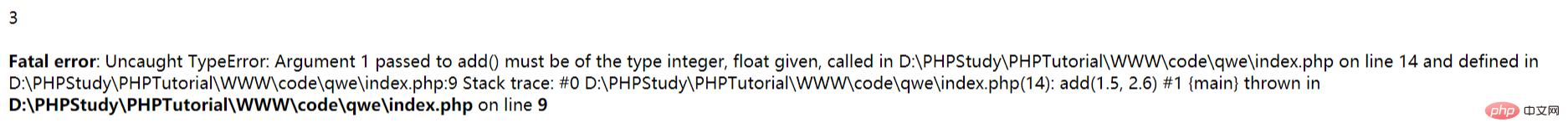 php5是无法执行上面代码的,php7执行的时候会先输出一个3和一个报错( Argument 1 passed to add() must be of the type integer, float given);